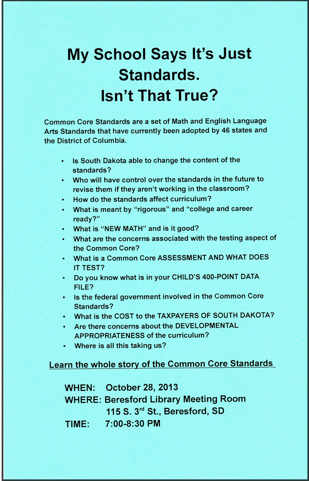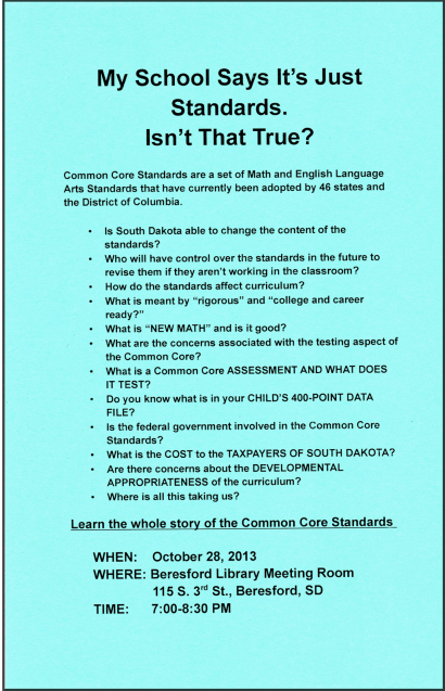 Common Core Information and Action, October 28, 2013, Beresford, SD maryscheelbuysse / October 16, 2013 Share this: Click to share on X (Opens in new window) X Click to share on Facebook (Opens in new window) Facebook Like Loading...